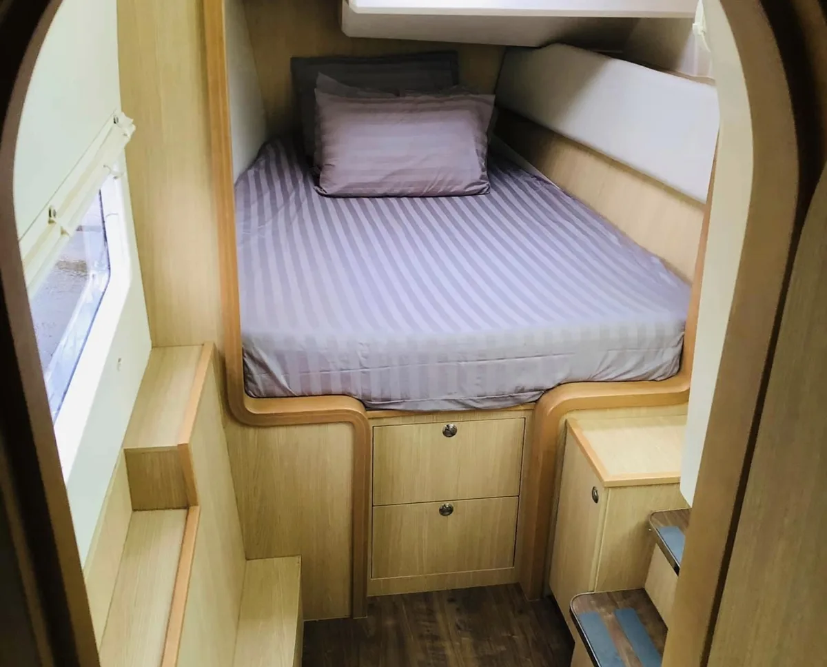 Each hull houses a surprisingly spacious stateroom, complete with air conditioning and an en-suite head / shower.