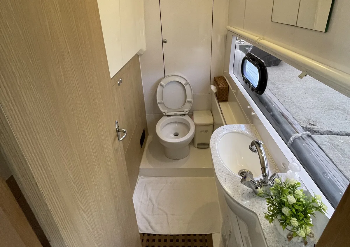 Each hull houses a surprisingly spacious stateroom, complete with air conditioning and an en-suite head / shower.