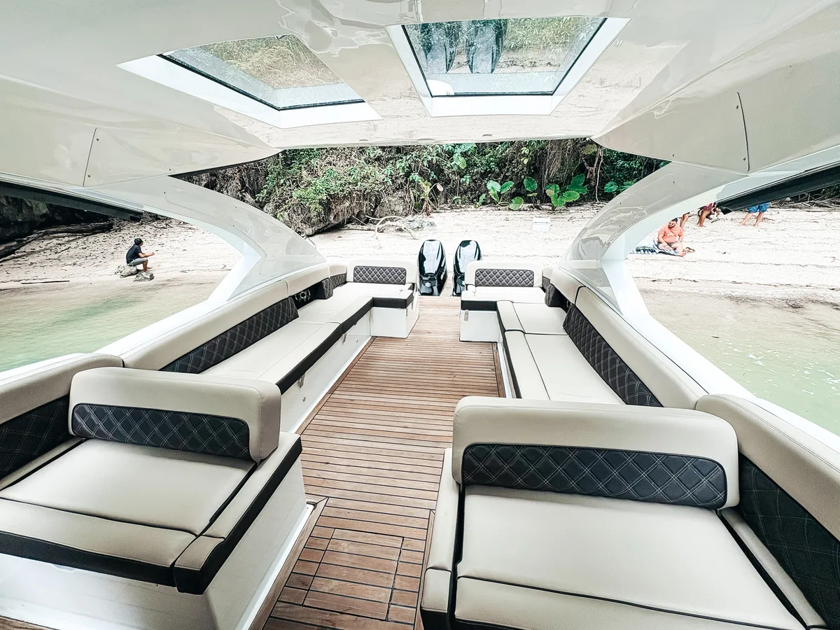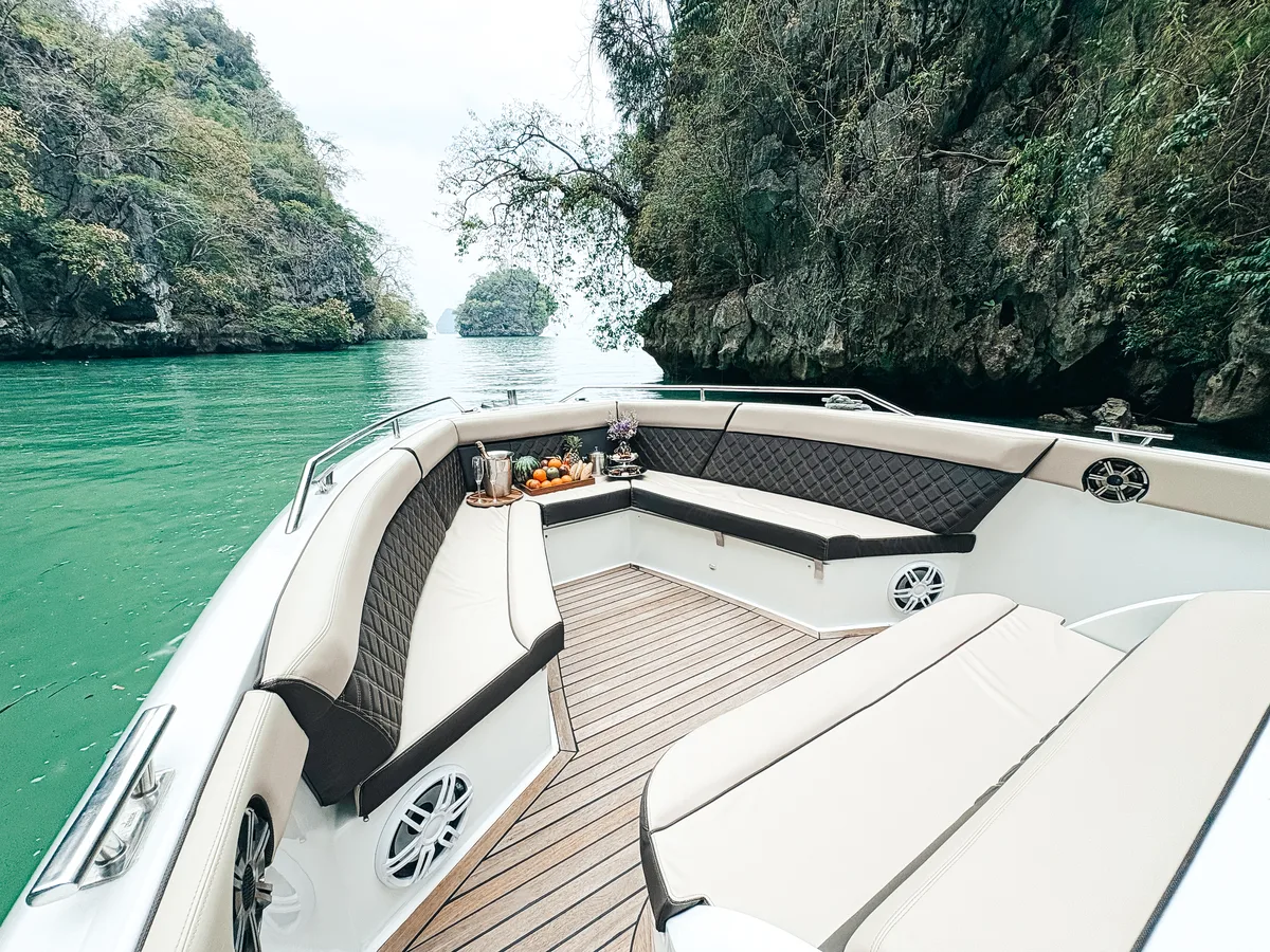 Our brand-new 2025 luxury speedboat for private Charter redefines exciting island-hopping in Phuket for up to 20 passengers. Designed for comfort and performance, it offers spacious seating and modern features like high-end sound system.