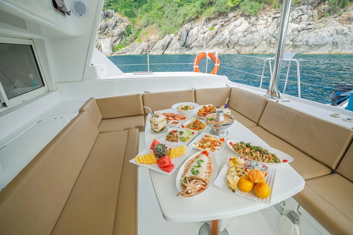 Embarquez pour une aventure d'une journée complète vers Coral Island / Banana Beach (Koh Hey) à bord du magnifique catamaran Lagoon de 50 pieds, le Blue Yeti. Ce navire luxueux peut confortablement accueillir jusqu'à 30 invités, ce qui en fait le choix parfait pour une journée de détente et d'exploration dans les eaux turquoise de Phuket.