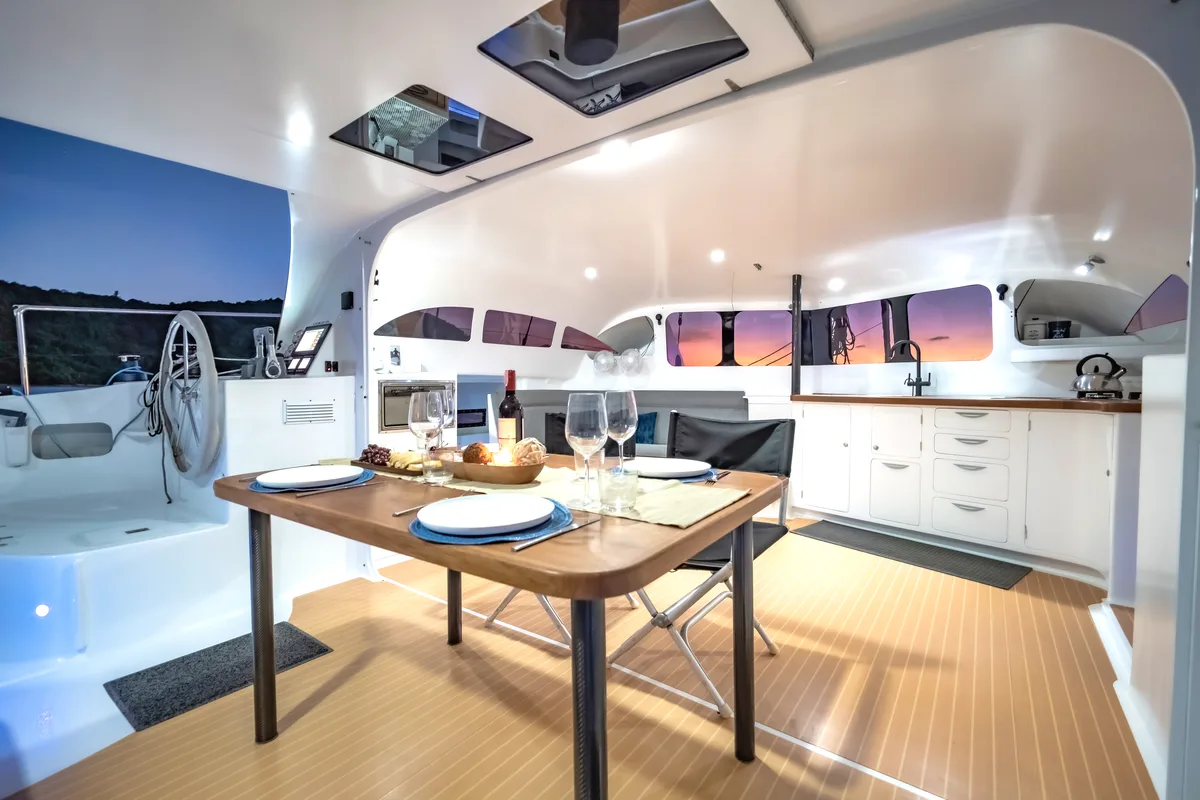 The simple, modern design sets an excellent contrast to the warm service from the crew, who do their job still with passion and love. The spacious open saloon with drop down windows offers perfect comfort in tropical waters.