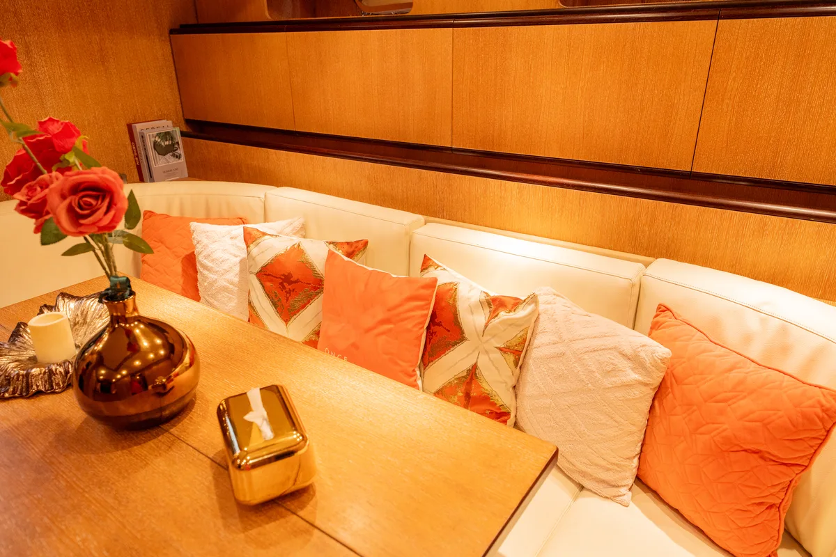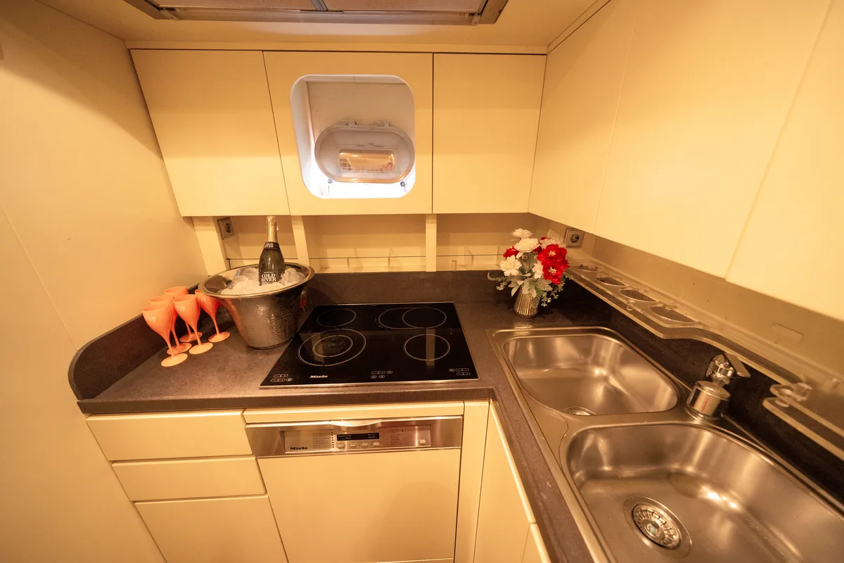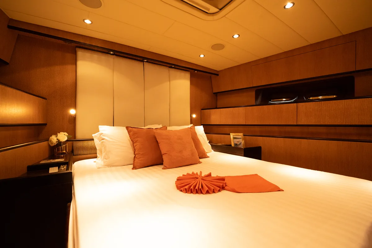Her sporty exterior is complemented by generous outdoor living spaces and a variety of watersport amenities, including a slider and floating pool, ensuring endless enjoyment on the water. Below deck, the interior offers elegant accommodation for six guests across three beautifully appointed cabins, each with en-suite facilities. The full-beam master suite, located amidships, boasts exceptional volume and natural light, while a forward VIP cabin and a twin guest cabin provide additional comfort and privacy.