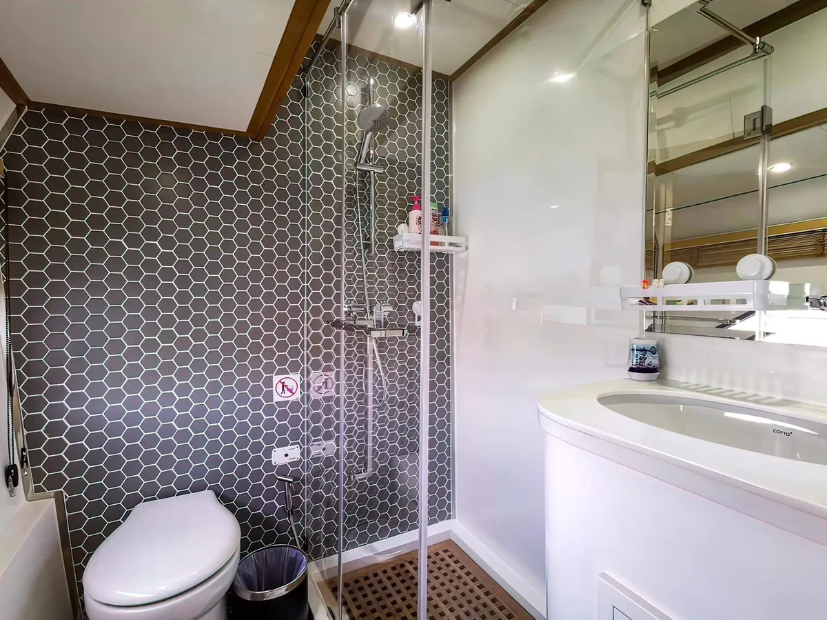 A fast speedster that comfortably takes smaller groups of up to 15 people to the most beautiful spots on the Andaman Sea and, not least thanks to the flybridge and the full equipment, is pure enjoyment. Private yacht charter in Phuket in best form!