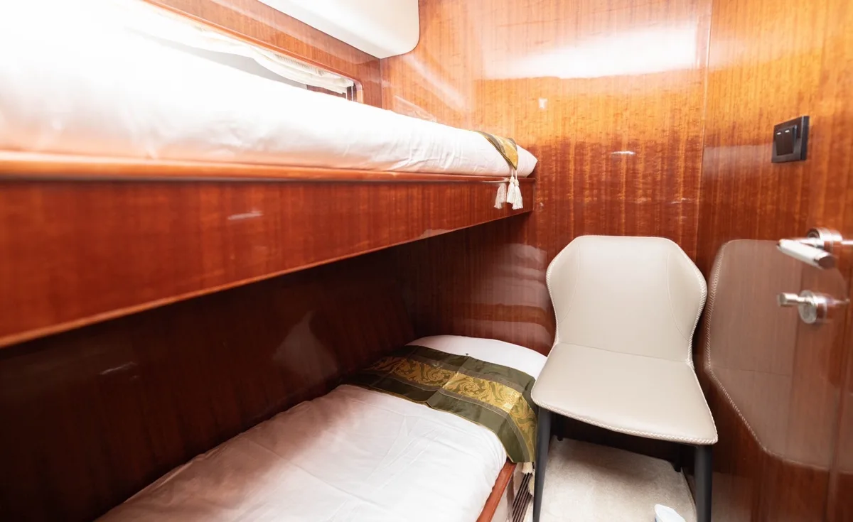 Naya can accommodate up to 20 guests on a day trip. The base charter price includes 10 guests — additional guests can be added for a per-person surcharge. For overnight charters, the yacht accommodates up to 6 guests in 3 cabins (4 included in the base price).