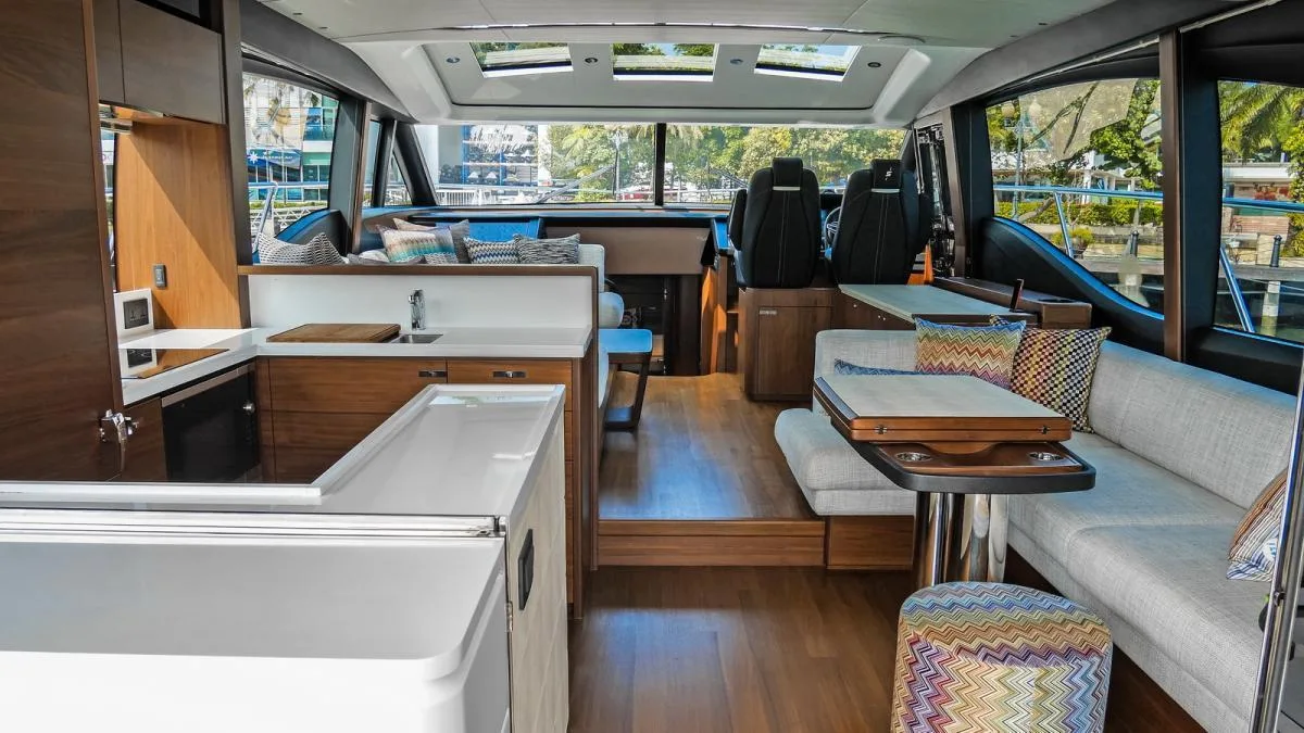 She represents the latest in advanced hull design that delivers outstanding sea-keeping and comfortable cruising. The beautifully appointed galley aft of the saloon, with an open-plan dining area opposite, has sliding doors and a fully opening electric window which leads out to the cockpit creating an alfresco bar.