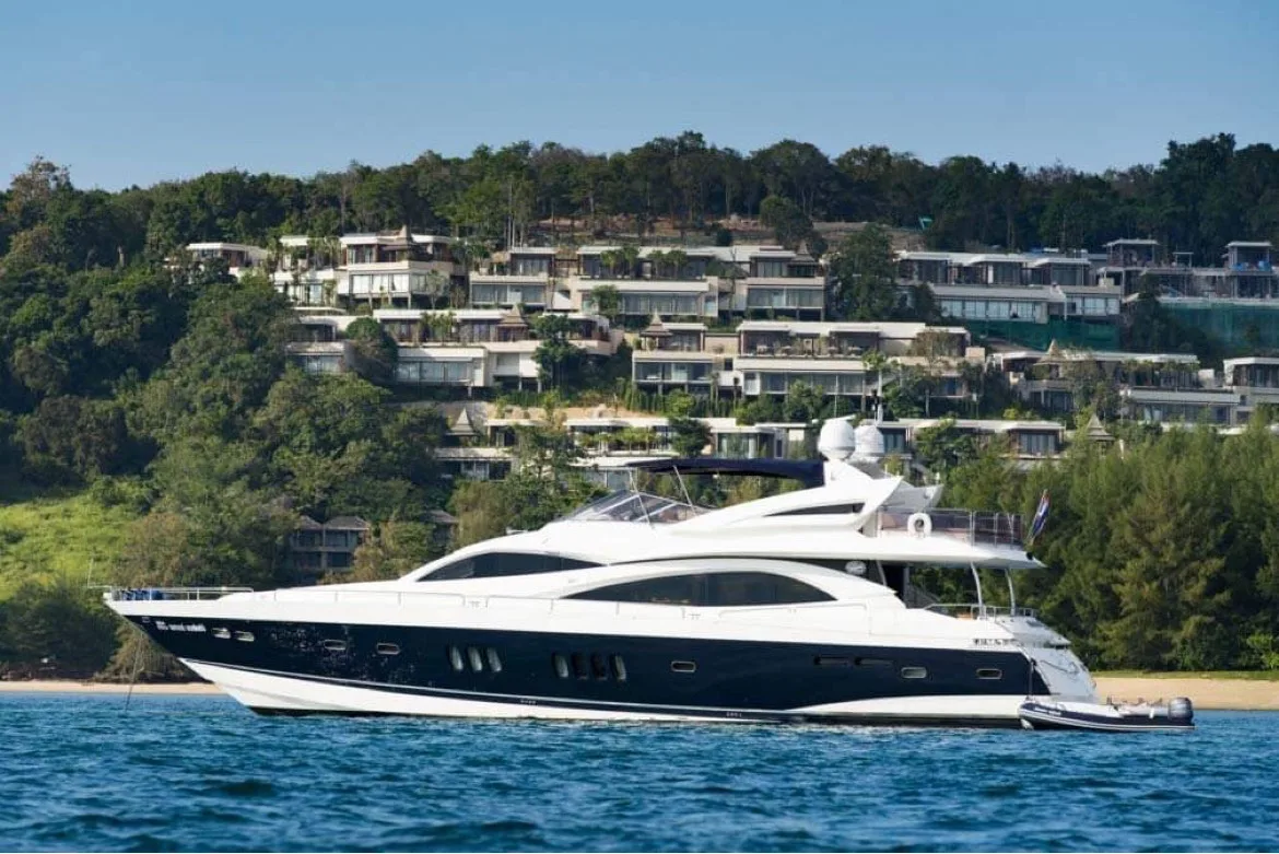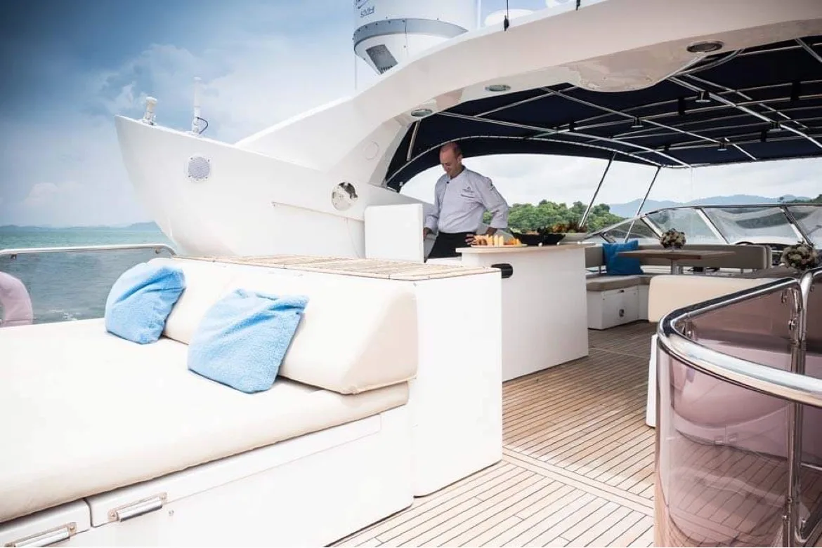 Her impressive flybridge with a wet bar is ideal for entertaining with panoramic views. The generous deck features two separate dining areas, along with two large sun pads for relaxing. On the lower deck, 4 cabins await up to 8 guests overnight.