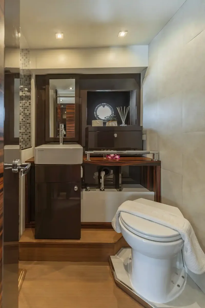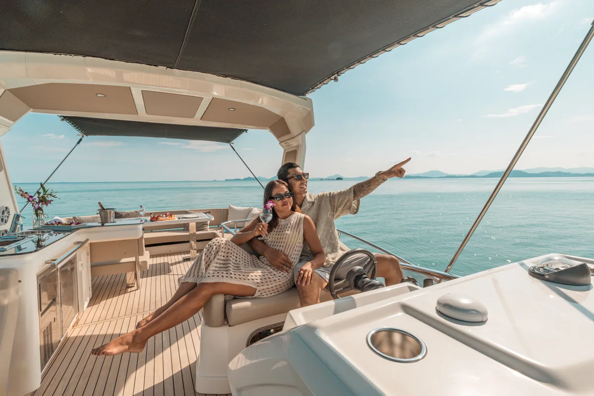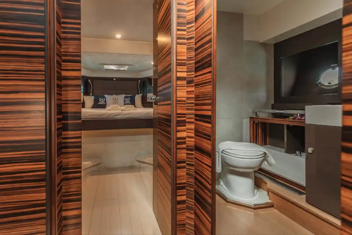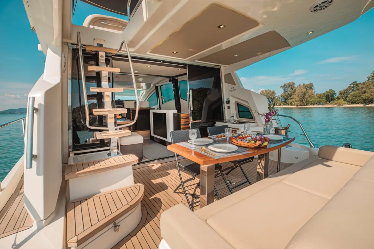 And ideal for those who enjoy cruising to farther destinations with speed and comfort while indulging in luxurious amenities and enjoying a wide array of watertoys. The spacious flybridge provides the perfect spot to relax and take in panoramic views, while the fully air-conditioned interior features a stylish salon, a fully equipped galley, and three elegant cabins for a truly unforgettable experience.