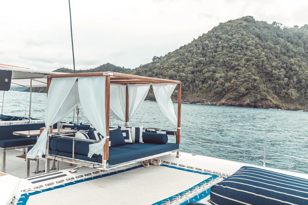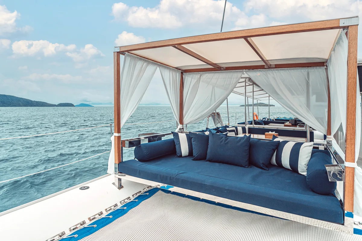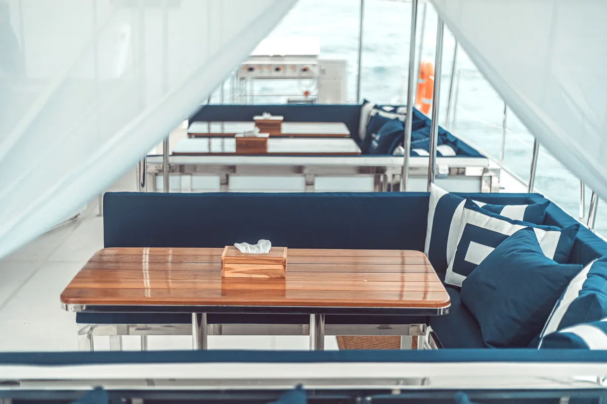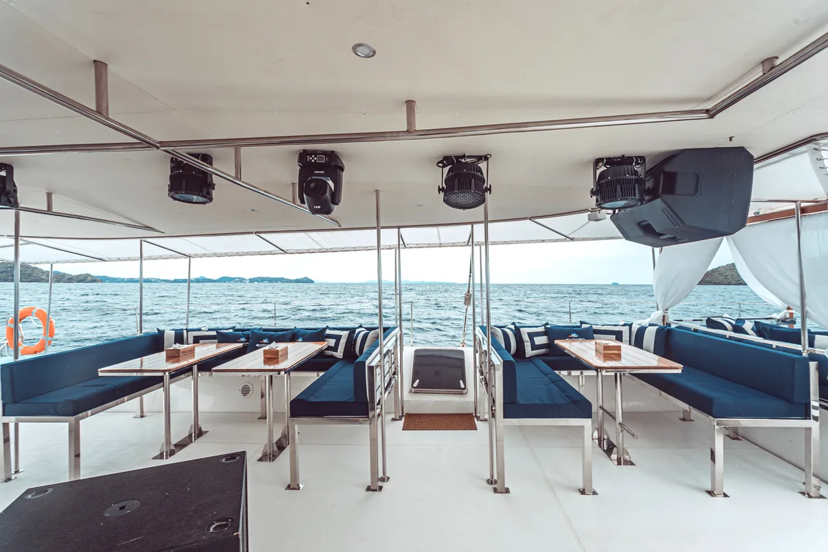 Joy has a galley and bar, and a nacelle with 10 settees (with 4 on each bench) and four dining tables. There are washrooms/changing rooms in each hull, and a chart table in the port hull.